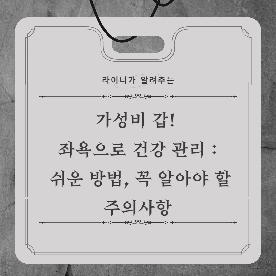 - 시간: 좌욕 시간은 10~15분이 적합하며, 너무 길게 하면 피부가 약해질 수 있으니 주의하세요.