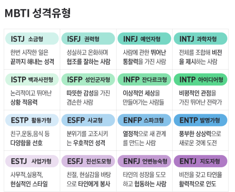 - 심리학 저널 및 연구 논문: 특정 MBTI 유형과 직업, 교육 수준, 문화적 배경과의 관계를 분석한 연구 결과. (https://psycnet.apa.org/journals/psp/)