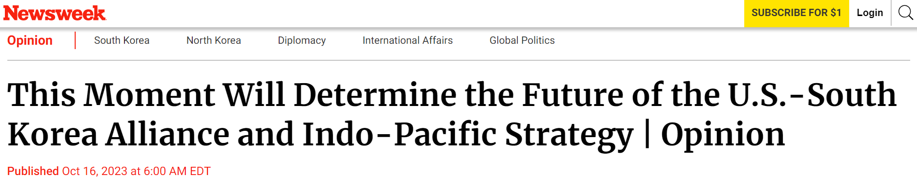 래리 호건은 2023년 10월 16일 뉴스위크에 "이 순간이 한미 동맹과 인도-태평양 전략의 미래를 결정할 것이다This Moment Will Determine the Future of the U.S.-South Korea Alliance and Indo-Pacific Strategy"라는 글을 기고했습니다.