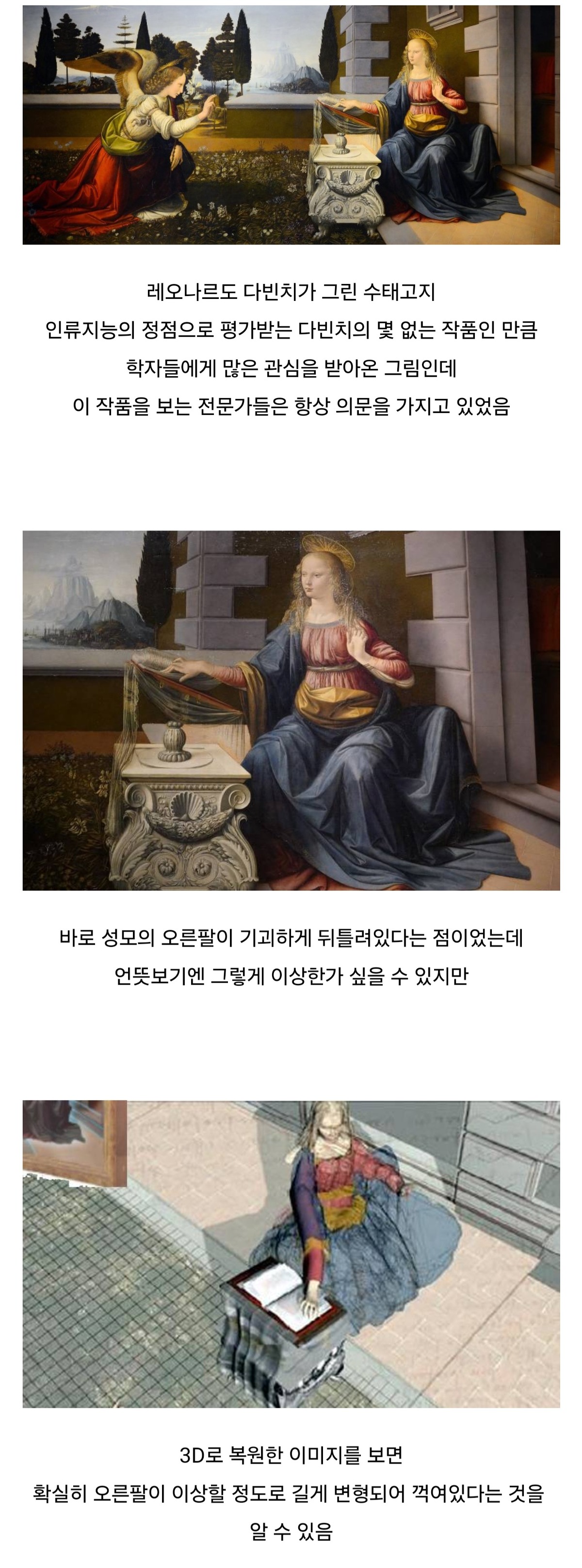 레오나르도 다빈치의 수태고지는 그의 뛰어난 관찰력, 표현력, 그리고 독창적인 예술적 감각을 보여주는 작품입니다. 이 작품은 다빈치가 20세 초반이라는 어린 나이에도 불구하고 이미 뛰어난 예술가로 성장했음을 증명합니다.