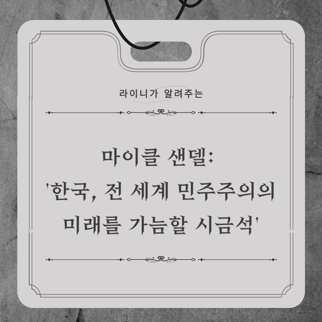- 하버드대 정치철학자 마이클 샌델 교수가 한국의 비상 개엄 사태와 대통령 탄핵을 둘러싼 현재 상황에 대해 깊은 관심을 표하며, 이를 전 세계 민주주의의 발전 방향을 결정할 중요한 시험대로 평가했습니다.