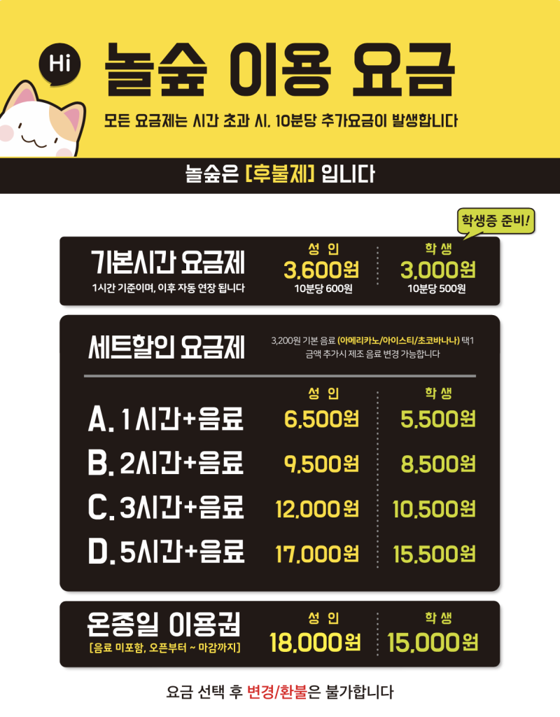 - 놀숲 이용 방법: 놀숲은 시간당 이용 요금을 기준으로 운영됩니다. 평일에는 할인된 가격으로 이용할 수 있으며, 야간에는 추가 요금이 부과됩니다.