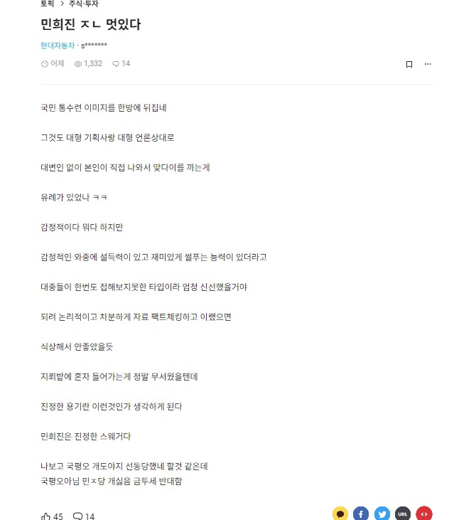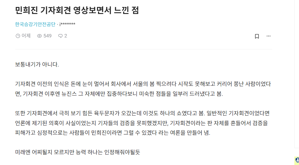 이번 사건의 진실과 거짓은 시간이 지나며 밝혀질 것입니다. 사람들은 기자회견이라면 의례히 떠올려지는 이미지를 가지고 있습니다. 그런데, 민대표의 기자 회견 방식은 기존에 가지고 있던 방식을 확실히 깨며 "새롭다!"라는 감성을 일으켰습니다.