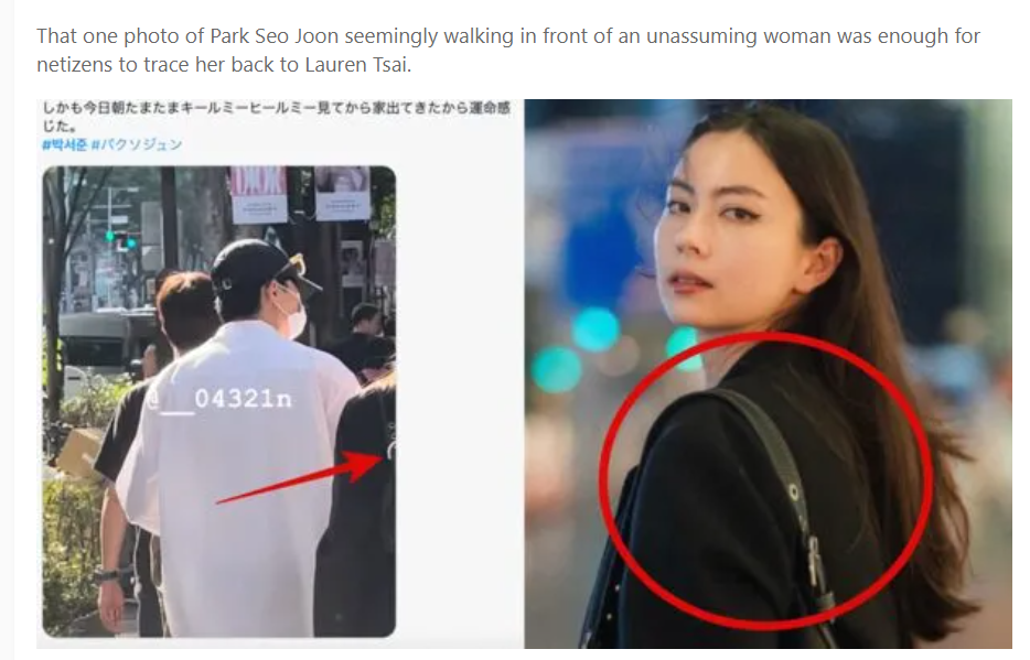 2024년 5월 18일, 한 트위터 사용자가 박서준이 일본 거리를 걷는 사진을 공유했습니다. 사진 속에는 박서준 뒤쪽으로 한 여성이 걸어가고 있습니다. 여성의 얼굴은 명확하게 드러나지 않았지만, 네티즌들은 다른 사진들을 통해 그녀를 로렌 차이로 확인했습니다.