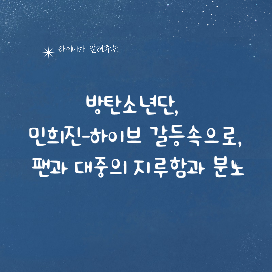 세계적인 아이돌 그룹 방탄소년단(BTS)의 빛나는 성공 뒤에는 지금 어두운 그림자가 드리우고 있다. 민희진 대표와 하이브 간의 갈등은 오랜 기간 지속되고 있으며, 최근에는 방탄소년단까지 관련 지적이 잇따르면서 팬덤 '아미'(ARMY)를 비롯한 일반 대중들의 지루함과 분노가 표출되고 있다.