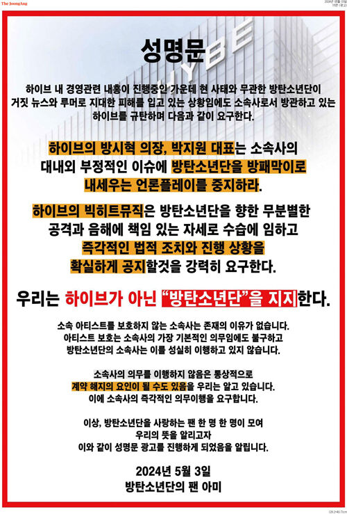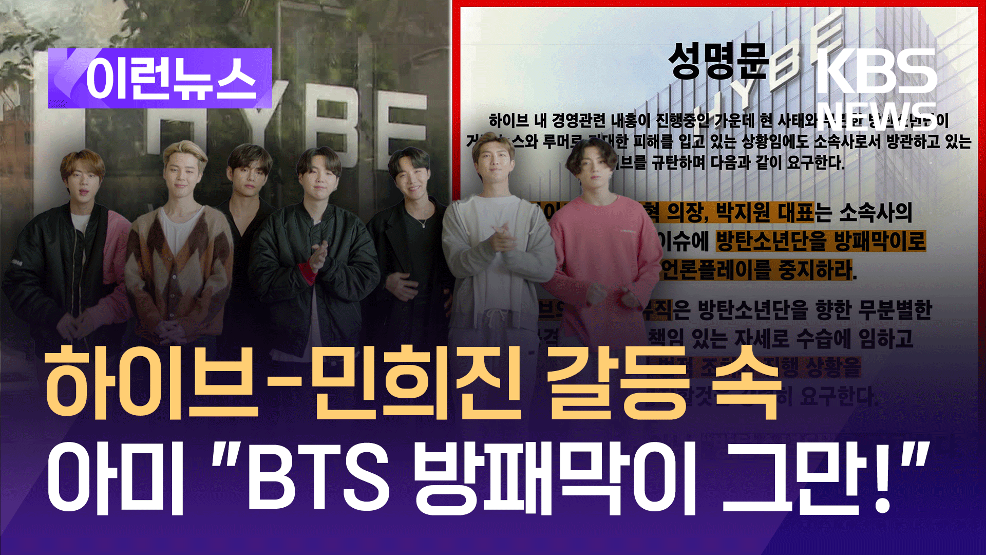 이에 팬들은 더 이상 방탄소년단이 하이브의 내분에 휘말려 피해를 입는 것을 용납할 수 없다는 입장이다. 하이브는 소속 아티스트를 소중하게 생각하고, 그들을 보호하고 지원해야 한다는 기본적인 의무를 다해야 한다. 그렇지 못하면 팬들의 분노는 더욱 커지고, 방탄소년단과 하이브의 관계는 더욱 악화될 수밖에 없다. 이 외에도 아미들은 하이브의 투명성 없는 경영, 진실 왜곡, 정보 조작, 방탄소년단 악용 등을 지적하며 강력한 대응을 요구하고 있다.