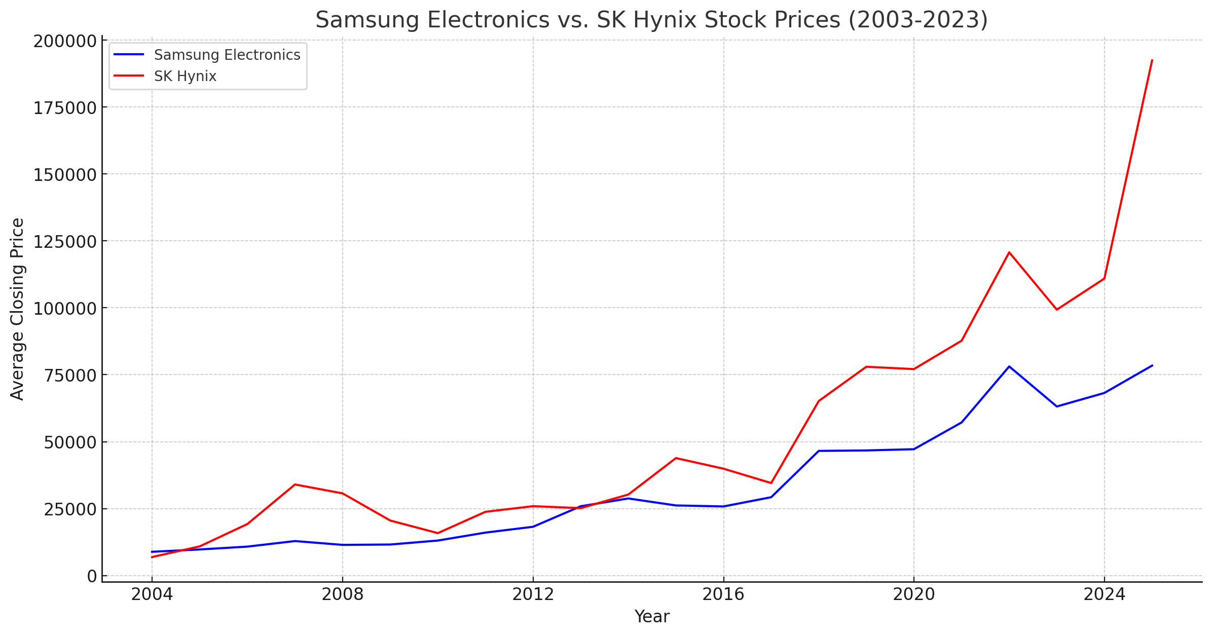 - 장기적 성장성: 삼성전자와 SK하이닉스 모두 장기적으로 강력한 성장세를 보였습니다. 이는 글로벌 반도체 시장의 수요 증가와 두 회사의 기술적 우위에 기인합니다.