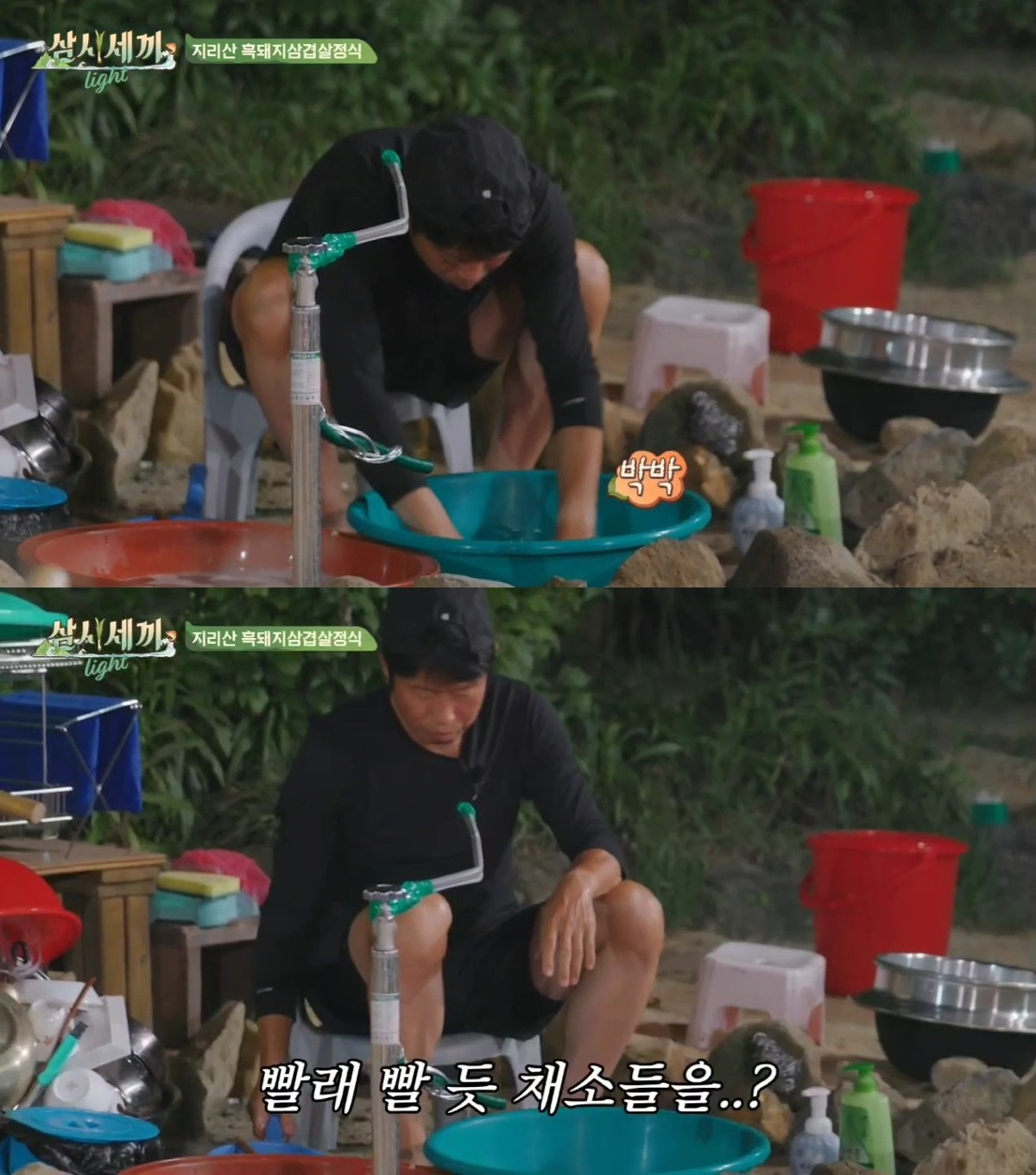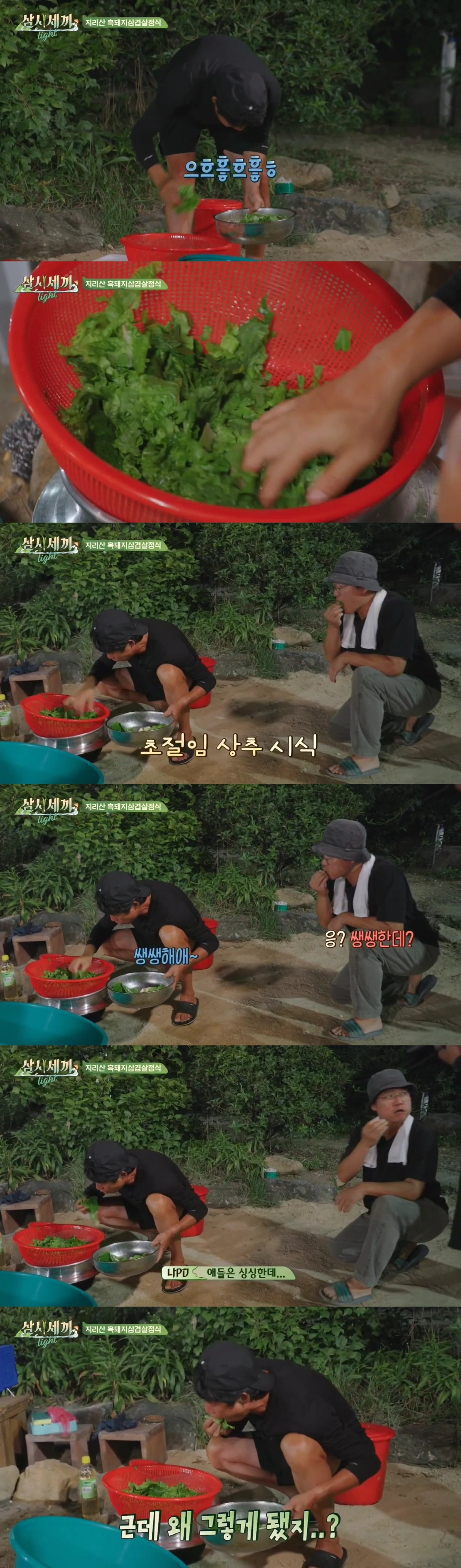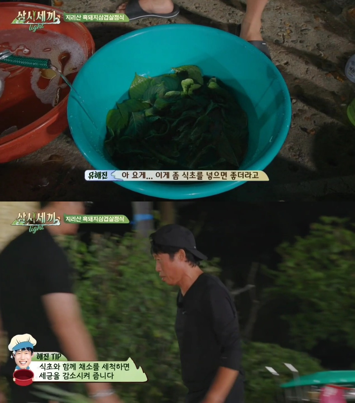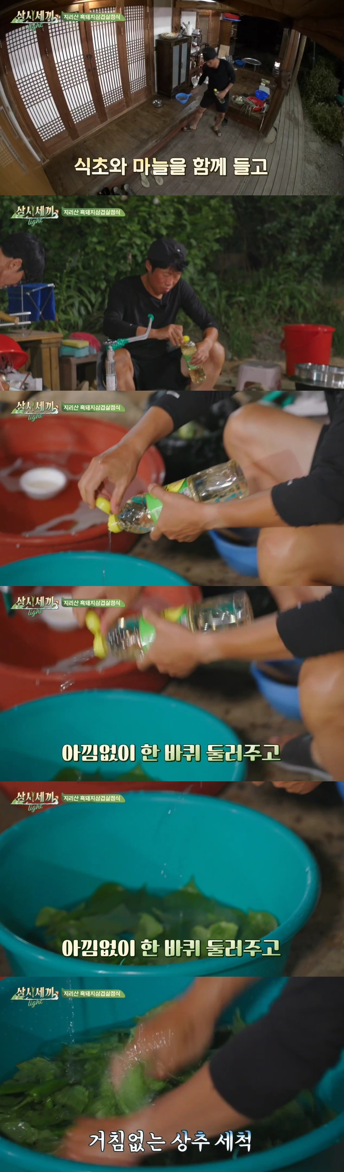 - 유해진은 상추를 씻는 과정에서 "식초를 넣으면 좋다"며 대야에 식초를 한 바퀴 돌려 넣고, 이를 더 넣어가며 마치 빨래를 하듯 상추를 세척하기 시작했습니다.