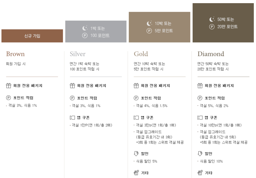 - VIP 혜택: 멤버십 등급에 따라 다양한 VIP 혜택을 제공합니다. 객실 업그레이드, 프리미엄 라운지 이용, 체크인/체크아웃 우선 처리 등을 통해 더욱 편리하고 특별한 경험을 선사합니다.