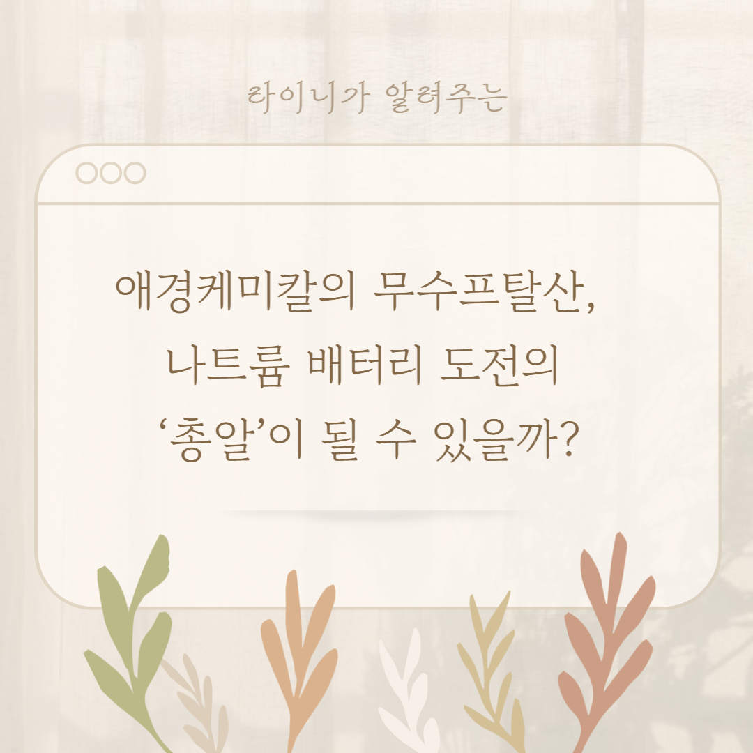 - 다만 분명히 보이는 건 있다. 애경케미칼은 무수프탈산이라는 캐시카우를 꽤 안정적으로 다루고 있고, 그 자금을 새로운 가능성 위에 배분해보려는 의지를 가진 기업이라는 점이다.