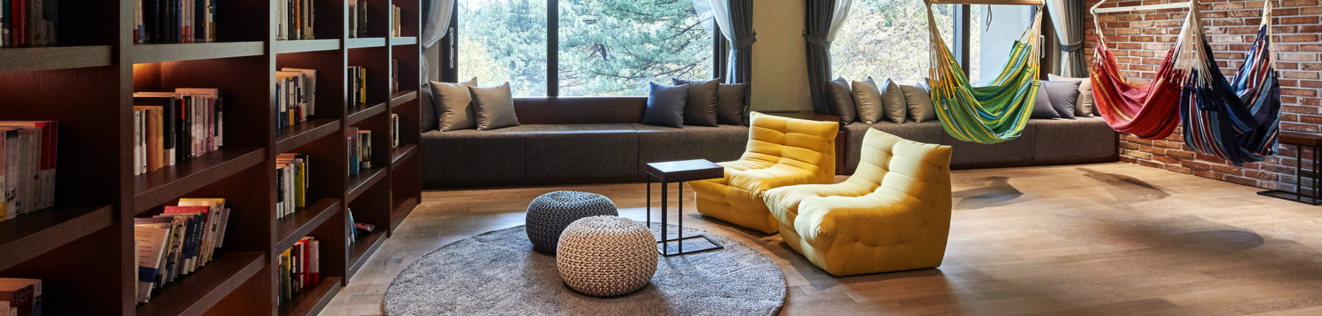 - 매달 최인아 책방에서 직접 큐레이션한 책들을 만나보세요. 편안한 의자와 해먹에서 자유롭게 독서에 몰두할 수 있는 조용한 공간입니다.
