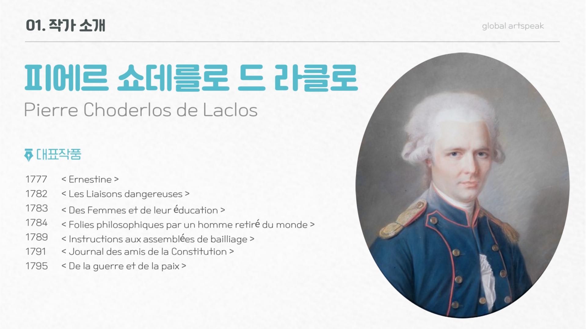 - 시대와 작가: 피에르 쇼데를로 드 라클로는 18세기 프랑스의 장교이자 소설가로, "위험한 관계"라는 작품으로 유명합니다. 이 소설은 고귀한 계층의 음모와 부도덕함을 다룹니다.