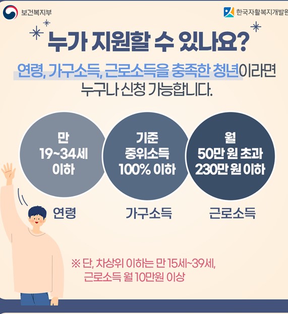 - 단, 기초 생활수급자, 차상위계층, 중위소득 50% 이하인 청년은 현재 근로 활동 중이며 소득이 월 10만 원 이상이라면 지원합니다.