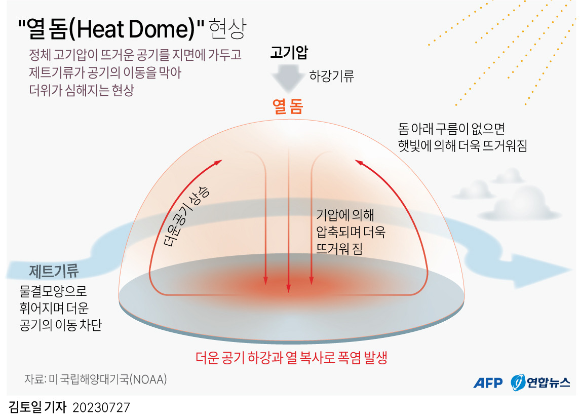 - 열 돔: 고기압이 강하게 자리 잡아 뜨거운 공기가 지면에 갇히고, 아래로 누르면서 계속 덥고 무더운 상태가 이어지는 현상 즉, 봄엔 찬 공기를 몰고 왔던 상층 기류가, 여름엔 더운 공기를 눌러놓는 작용으로 전환되면서 장기 폭염이 이어질 수 있는 조건이 되는 것이죠.