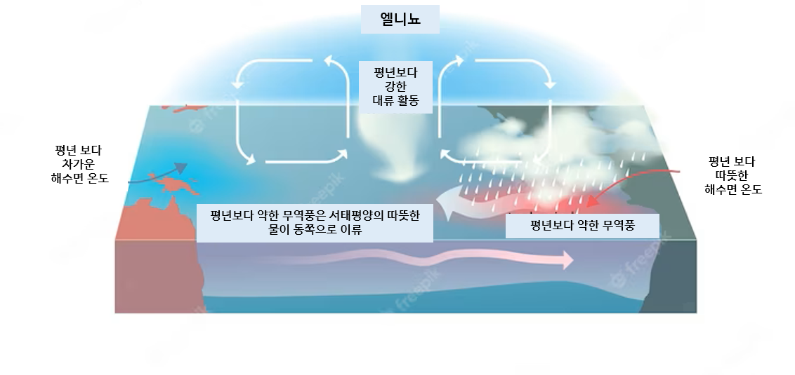 2023~2024년에 걸쳐 나타난 강한 엘니뇨(El Niño) 현상은 아직 끝나지 않았습니다. 엘니뇨는 적도 태평양의 해수면 온도를 비정상적으로 상승시켜, 지구 전역의 기압계, 강수, 기온 패턴에 광범위한 영향을 미치는 기후 교란 요인입니다.